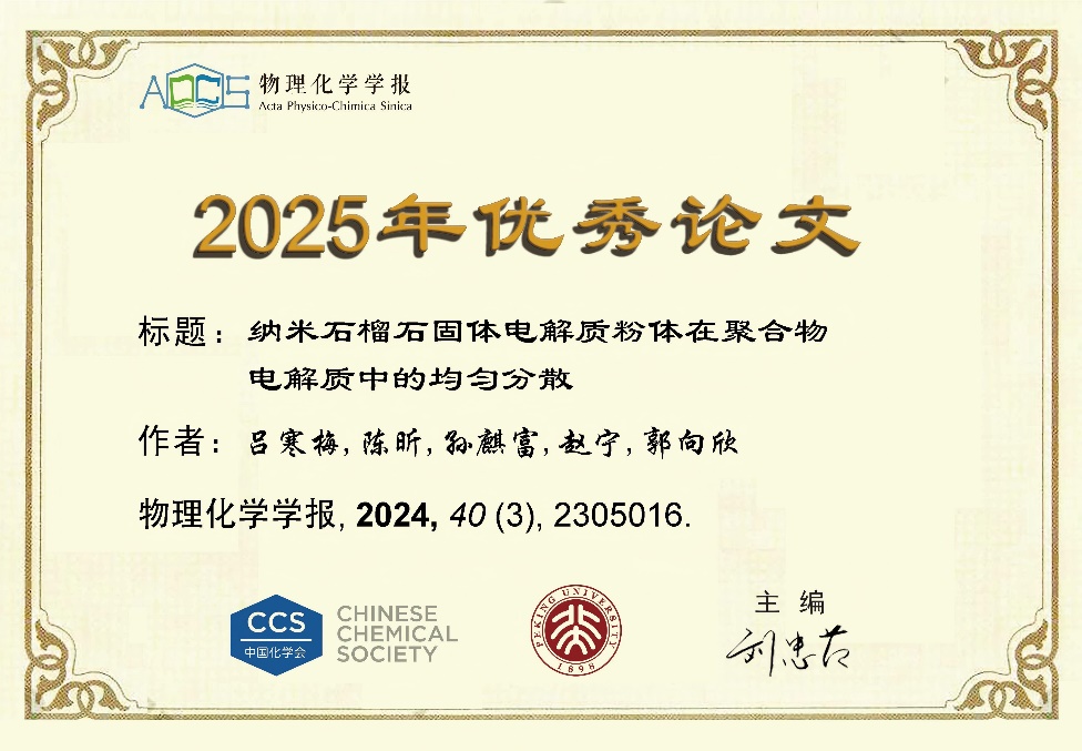 赵宁、郭向欣教授在固态电池领域的研究成果《纳米石榴石固体电解质粉体在聚合物电解质中的均匀分散》获评《物理化学学报》优秀论文。该论文第一作者为吕寒梅硕士,赵宁、郭向欣教授为通讯作者。